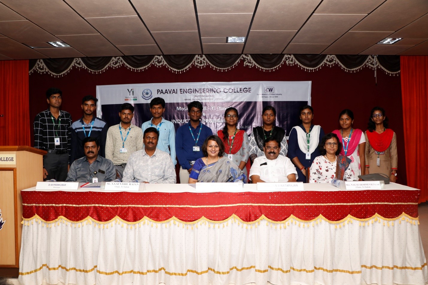 A Memorandum of Understanding (MoU) was signed by Paavai engineering college and CII-Young Indians(Yuva) on 02.06.2022.The programme started in the presence of Shri.CA.N.V.Natarajan, Chairman, Paavai Institutions, Guest Speaker Mrs.Sheetal Gandhi, Chair, Yi Tiruppur, Dr.M.Premkumar, Principal, Paavai Engineering College, Mr.S S. Senthilrajan, Chair, Yi Salem, Mrs. Nagalakshmi Vignesh, Co-Chair, Yi Salem, Prof.M.Mohan, First Year HoD, Faculty Coordinator Mrs.A.Samundeeswari, AsP, ECE, along with the CII-Young Indians(Yuva) students of all the departments of Paavai Engineering College.