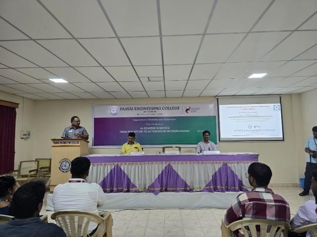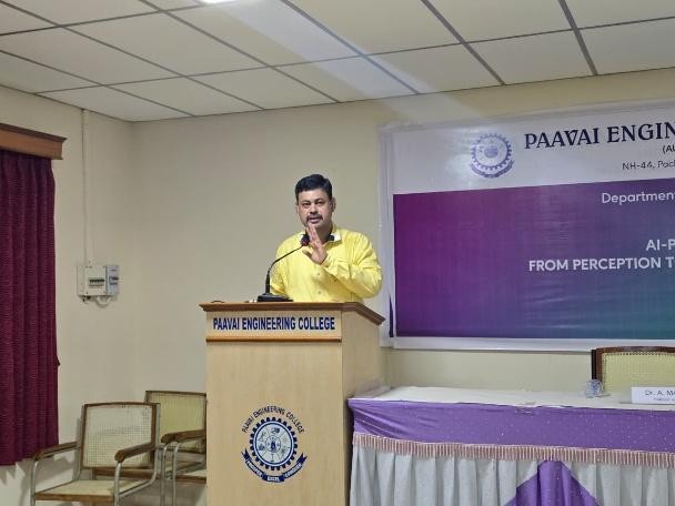 The Department of Robotics and Automation, Paavai Engineering College, organized a Guest Lecture on “AI-Powered Robotics: From Perception to Autonomous Decision-Making” on 3rd November 2025 (Monday) at 11.00 a.m. in Cute Hall.
