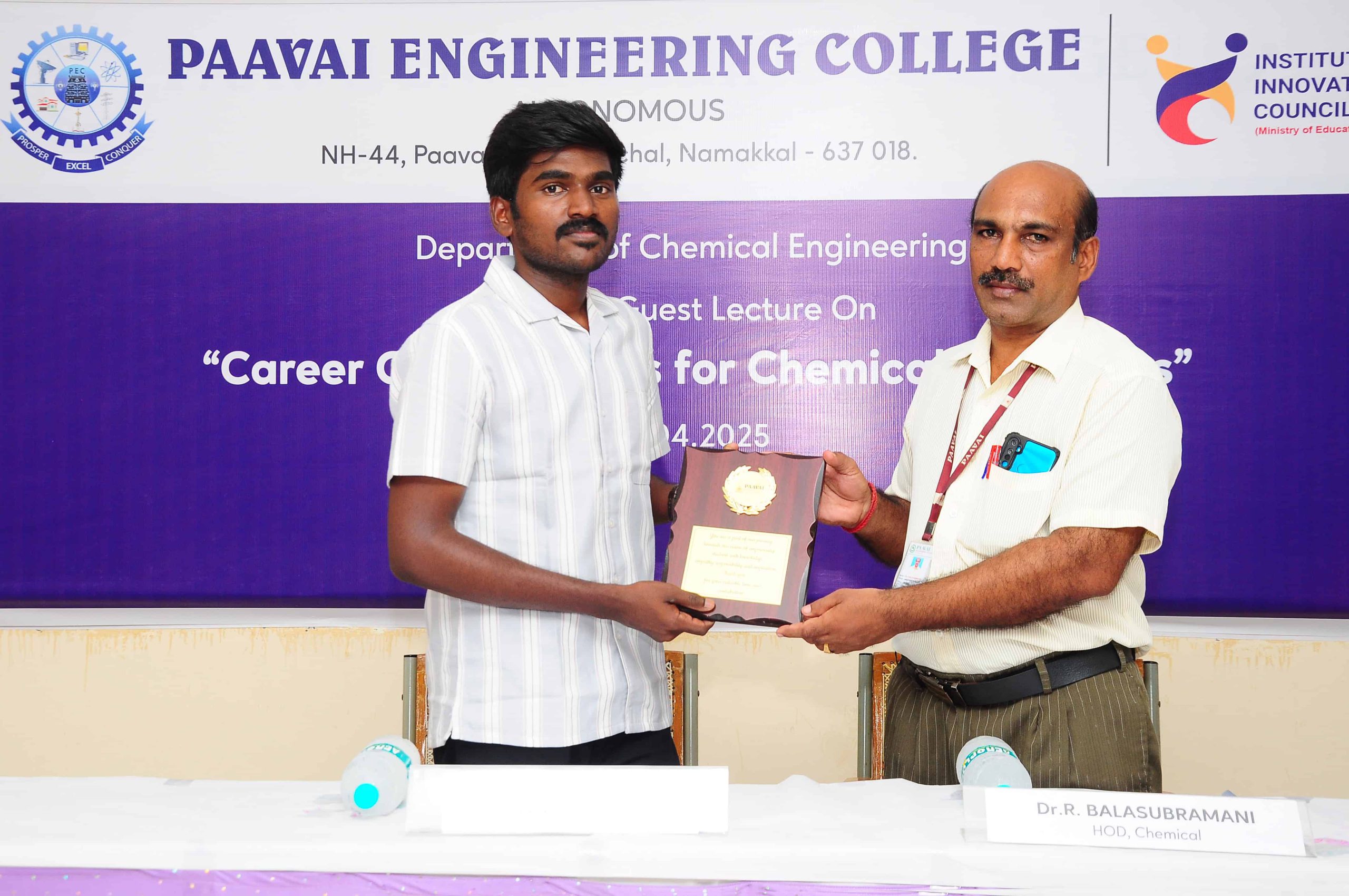 The alumni speaker for the session was Mr. A. Akash, Technology Transfer Executive at OmniActive Health Technologies Pvt. Ltd., Hosur. He shared valuable insights into the diverse career opportunities available for chemical engineers across various sectors including the chemical industry, oil & gas, pharmaceuticals, food processing, and paint manufacturing.