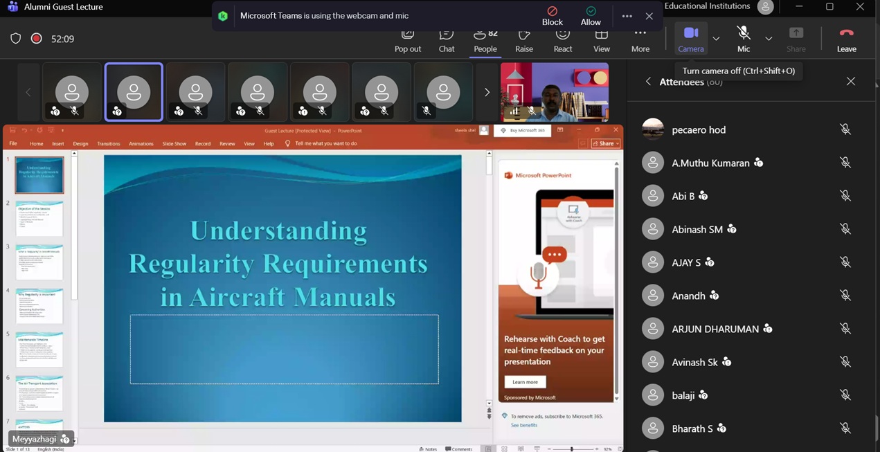 The Department of Aeronautical Engineering organized an Alumni Guest Lecture on 11.04.2026 through Online Mode (Microsoft Teams). The session was delivered by Ms.S.Meyyazhagi, Associate Engineer II at Capegemini Technology Services India Ltd, who belongs to the 2019-2023 Batch of the department.