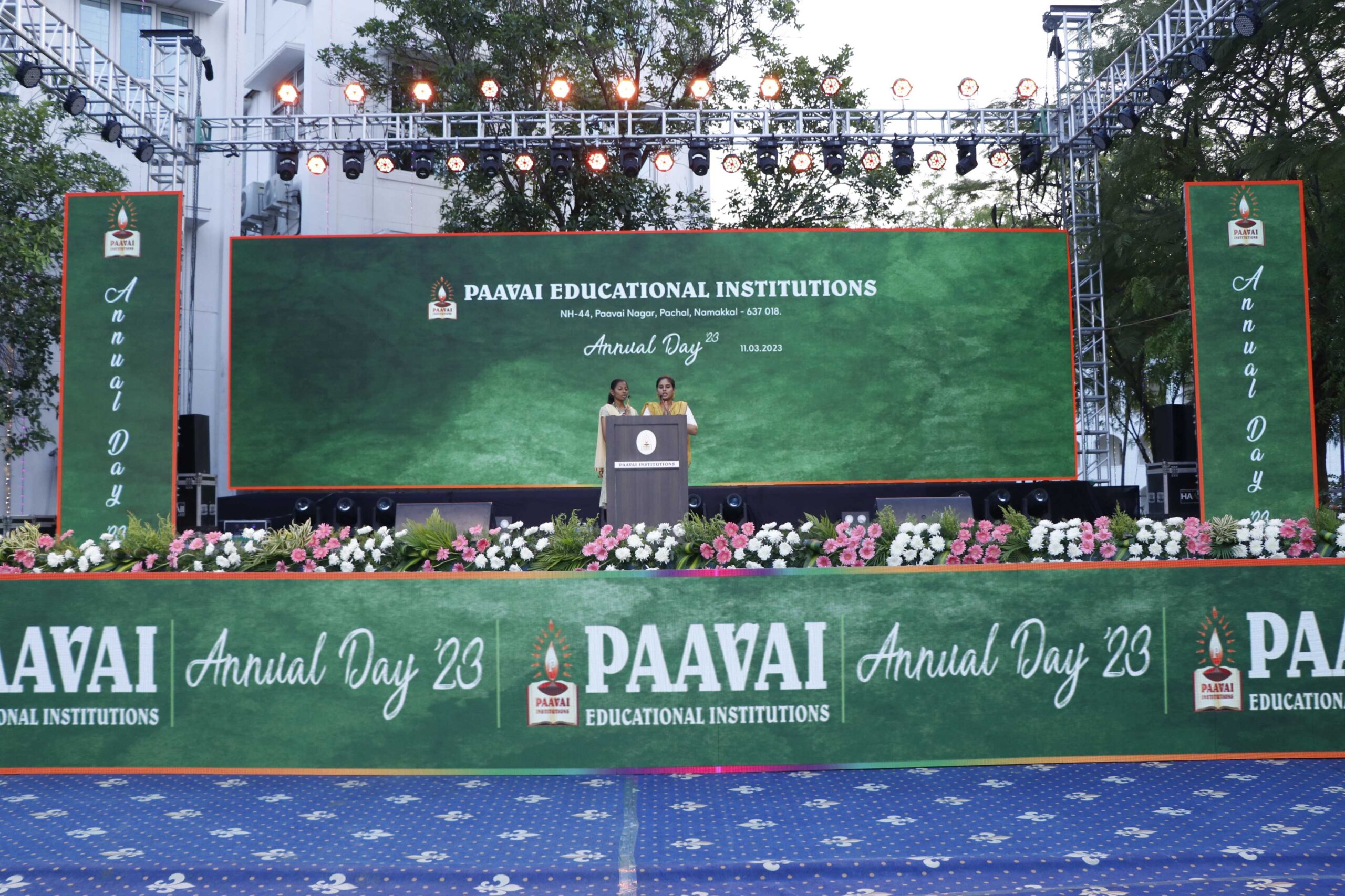 The Annual day 2023 of Paavai Institutions was held in magnificent way on March 11th, in Kalpana Chawla Open theatre. The event commenced with a Prayer song followed by Tamil Thai Vazhthu. The combined annual report of Paavai Institutions was presented through an audio-visual by Dr.M.Premkumar, Principal, Paavai Engineering College. Shri.CA.N.V.Natarajan, Chairman, Paavai Institutions welcomed the gathering and presided over the function.