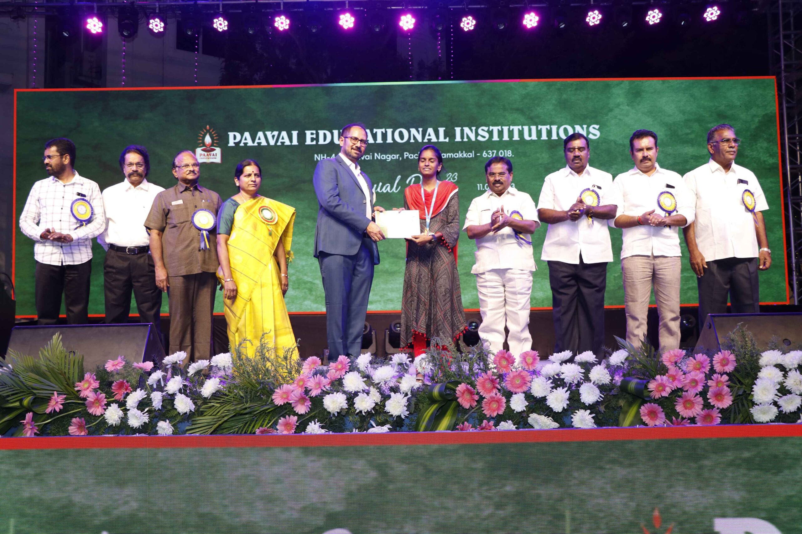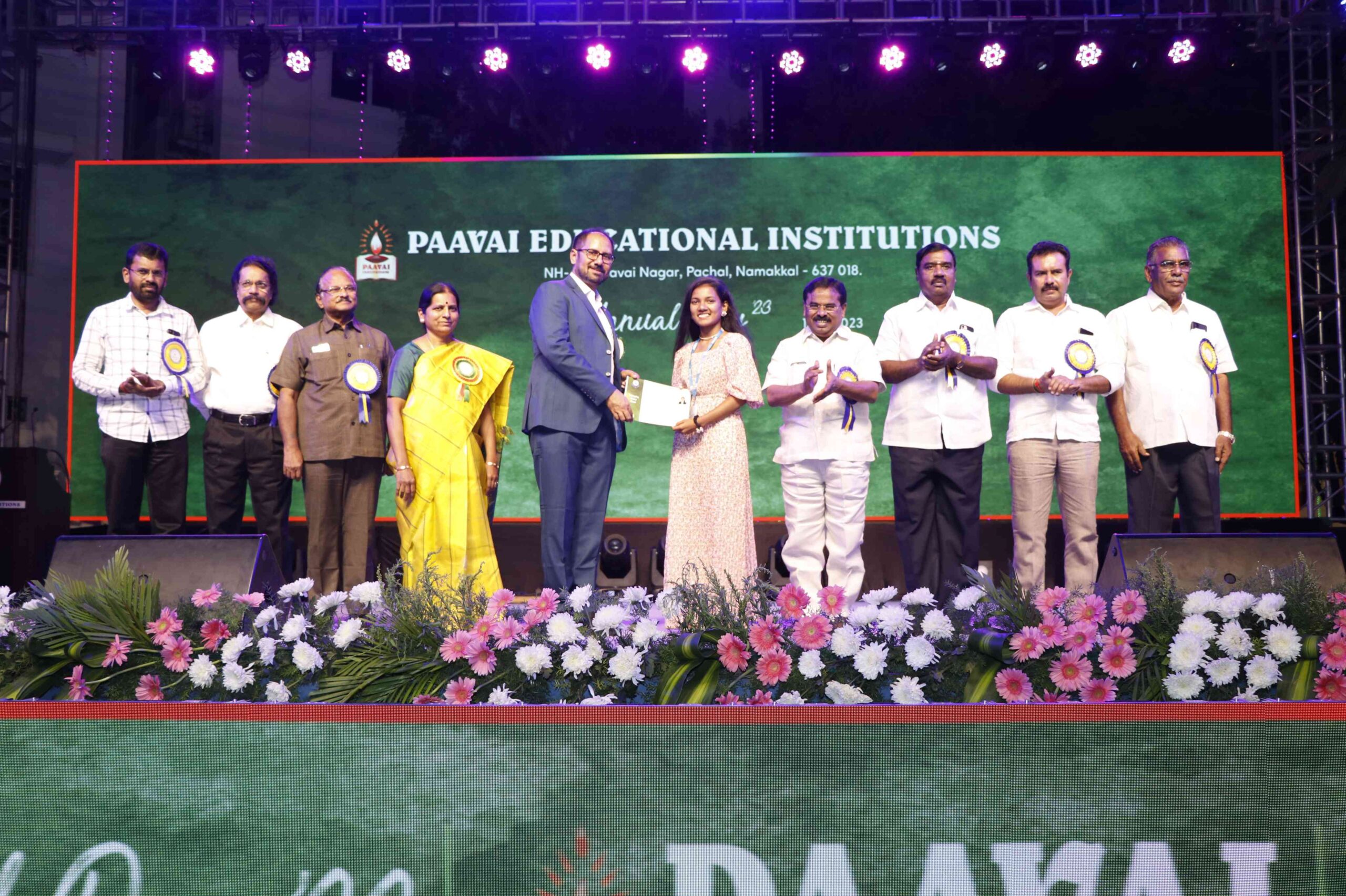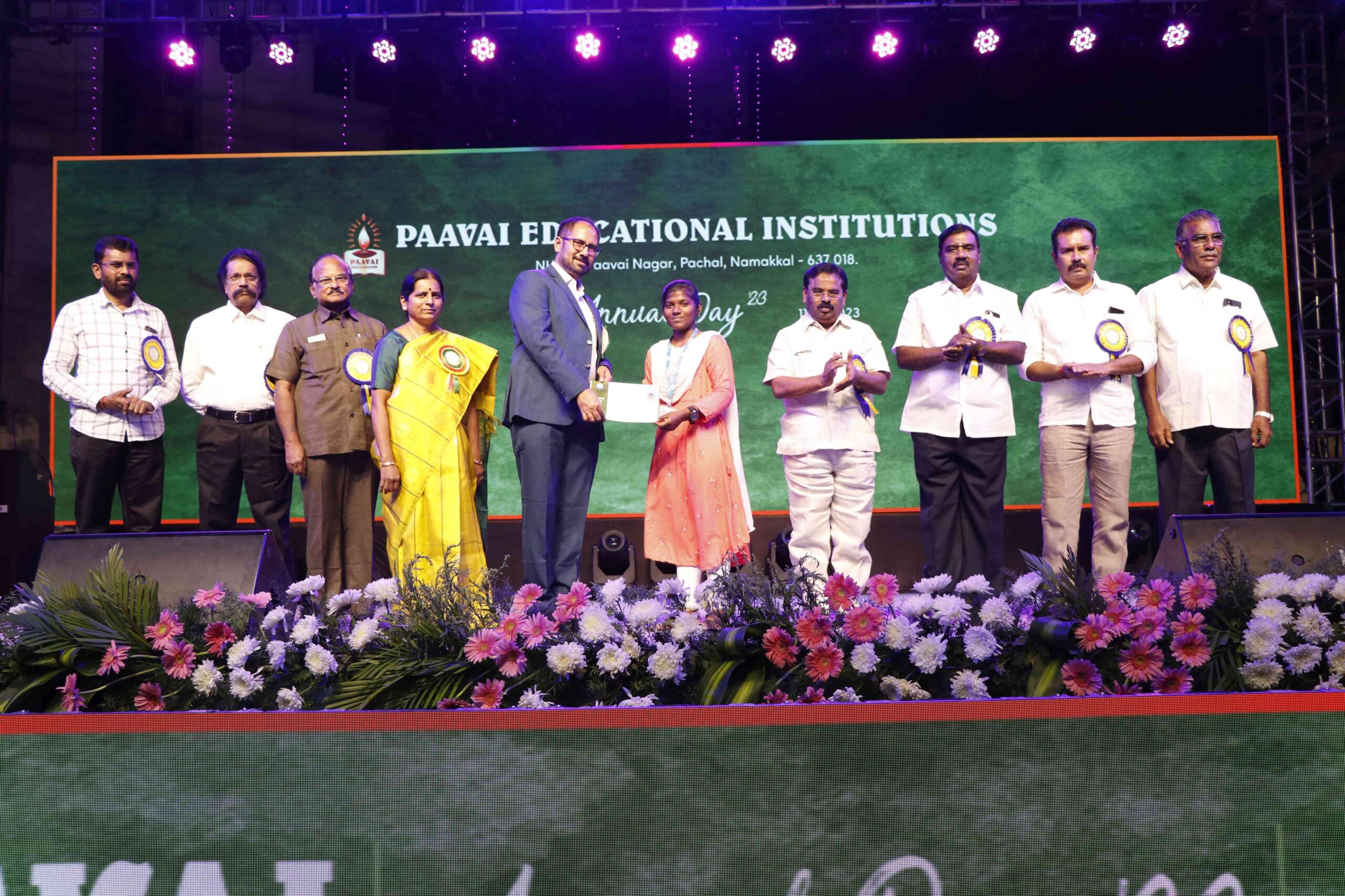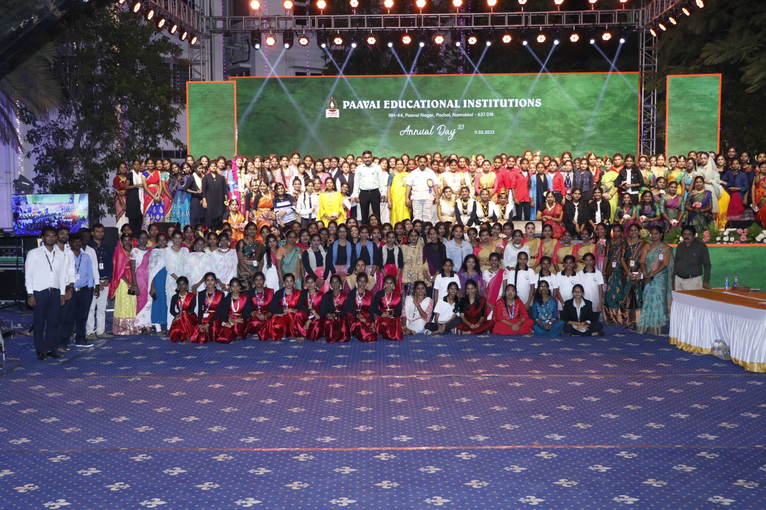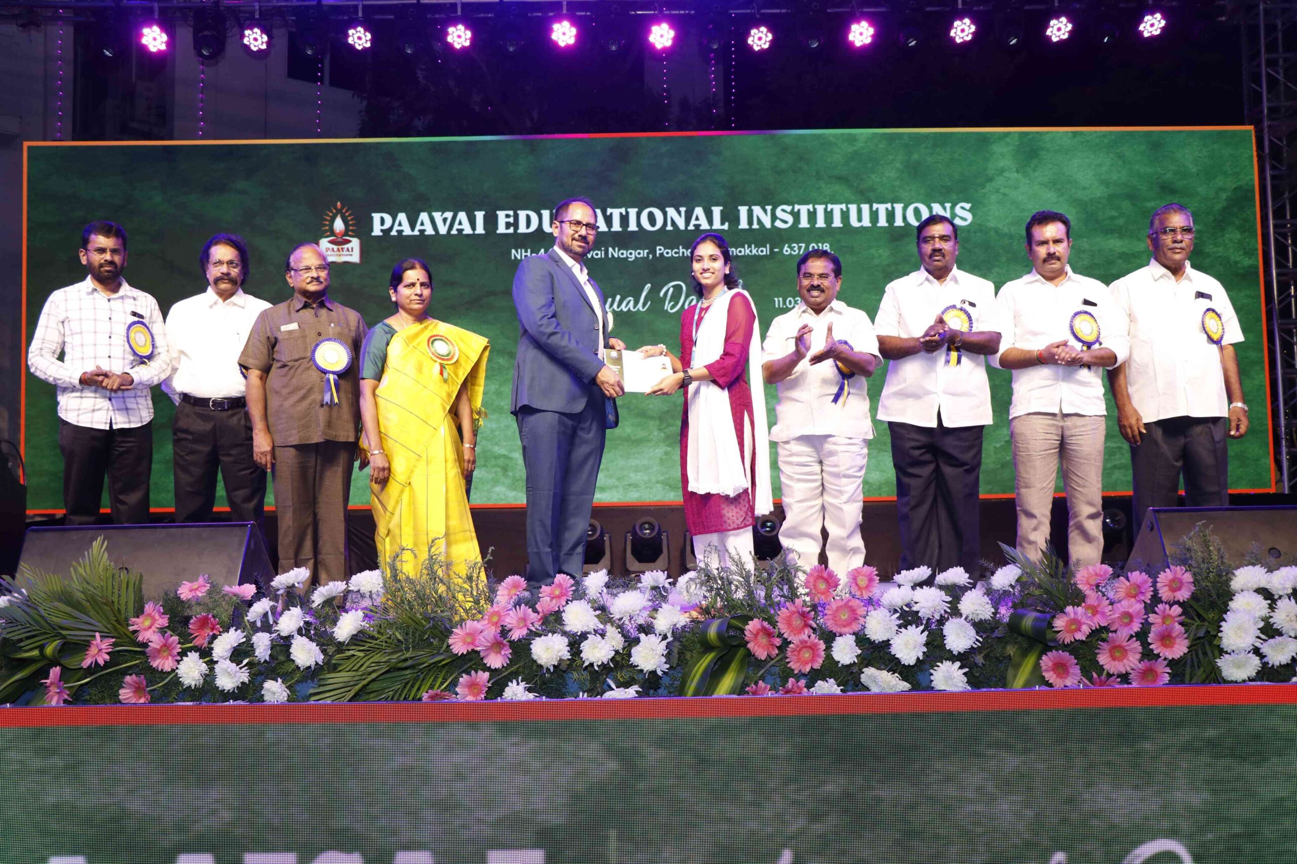 Forty-five variegated cultural events were performed by the students that ornamented the annual day and it was indeed a professional show that captivated the eyes of many. The best outgoing students of various departments of all Paavai Institutions were awarded. The Vote of thanks was proposed by Smt.Mangai Natarajan, Correspondent, Paavai Institutions. The Vice-Chairman, Secretary, Treasurer, Joint Secretary, Directors of Paavai Institutions, Deans, Principals, Special invites, Professors, parents, and students graced the occasion.