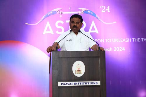 “ASTRA 2024” – A two day intra-collegiate cultural extravaganza was organized by Paavai Educational Institutions under the student activity forum AURA and SPARISM on 14.03.2024 and 15.03.2024 for Engineering students headed by Director Student Affairs. Director Student Affairs cum ASTRA Convener Ar. Avanti Natarajan welcomed the gathering. In her welcome speech, she stated a decade of ASTRA has created a platform for the Paavaians to explore their inner potentials and become achievers.
