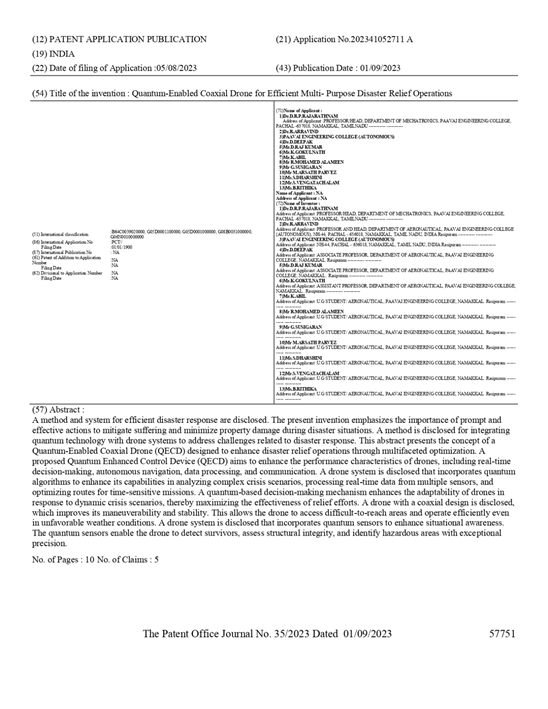 | 3 | Dr.D.R.P Rajarathnam | MCT | Patent Quantum-Enabled Coaxial Drone for Efficient Multi-Purpose Disaster Relief Operations | 01.09.23 | View |