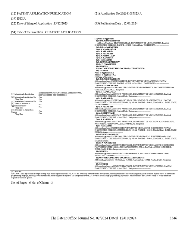 | 2 | Dr.D.R.P Rajarathnam | MCT | Patent Chatbot Application | 12.01.24 | View |