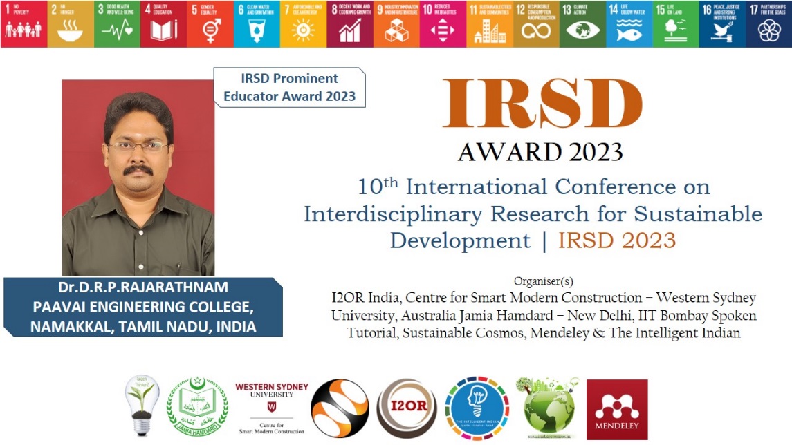| 1 | D.R.P. Rajarathnam, Professor/HOD | “IRSD Prominent Educator Award 2023” during the 10th International Conference on Interdisciplinarity and Research for Sustainable Development 2023 (IRSD 2023) | Organised by Green ThinkerZ, India & International Institute of Organised Research (I2OR), India | View | |