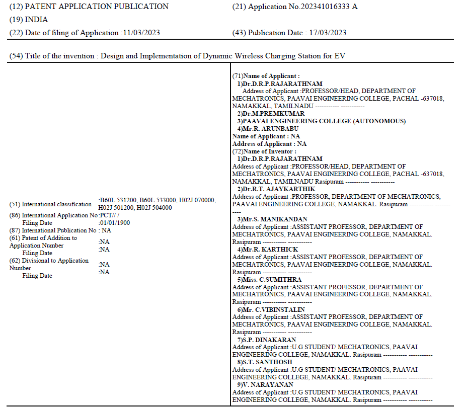 | 11 | Dr.D.R.P. Rajarathnam Dr.R.T. Ajaykarthik Mr.R. Arunbabu Mr.S. Manikandan Mr.R. Karthick Miss. C. Sumithra Mr. C.Vibinstalin | 202341016333 A | Design and Implementation of Dynamic Wireless Charging Station for EV | 2022-2023 | 17.03.23 |