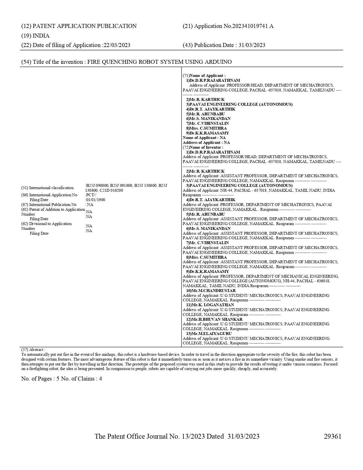 | 8 | Dr.D.R.P. Rajarathnam Dr.R.T. Ajaykarthik Mr.R. Arunbabu Mr.S. Manikandan Mr.R. Karthick Miss. C. Sumithra Mr. C.Vibinstalin | 202341019741 A | Fire Quenching Robot System Using Arduino | 2022-2023 | 31.03.23 |