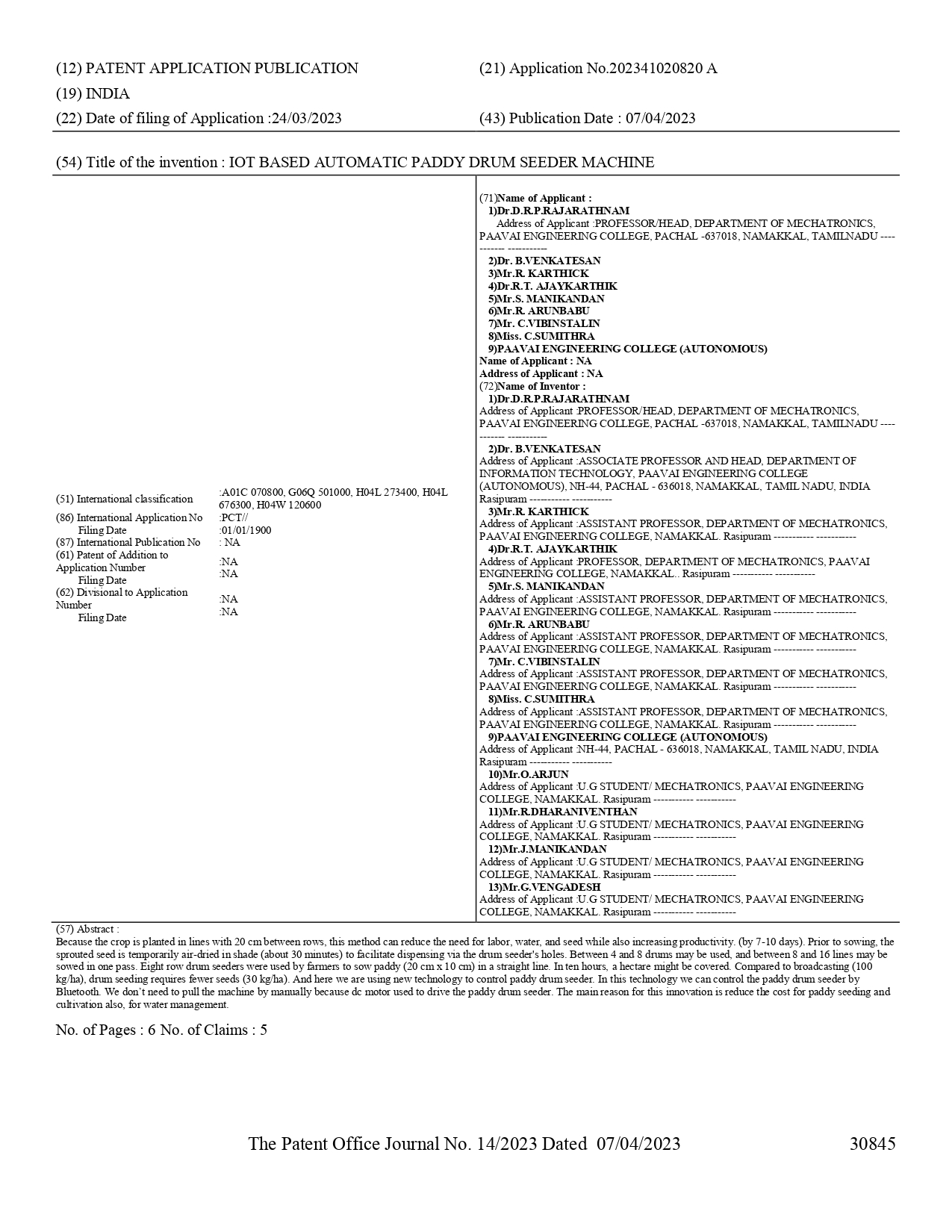 | 13 | Dr.D.R.P.Rajarathnam | 202441047684 A | IoT-Enabled RC Paddy Drum Seeder | 2024 | Published |