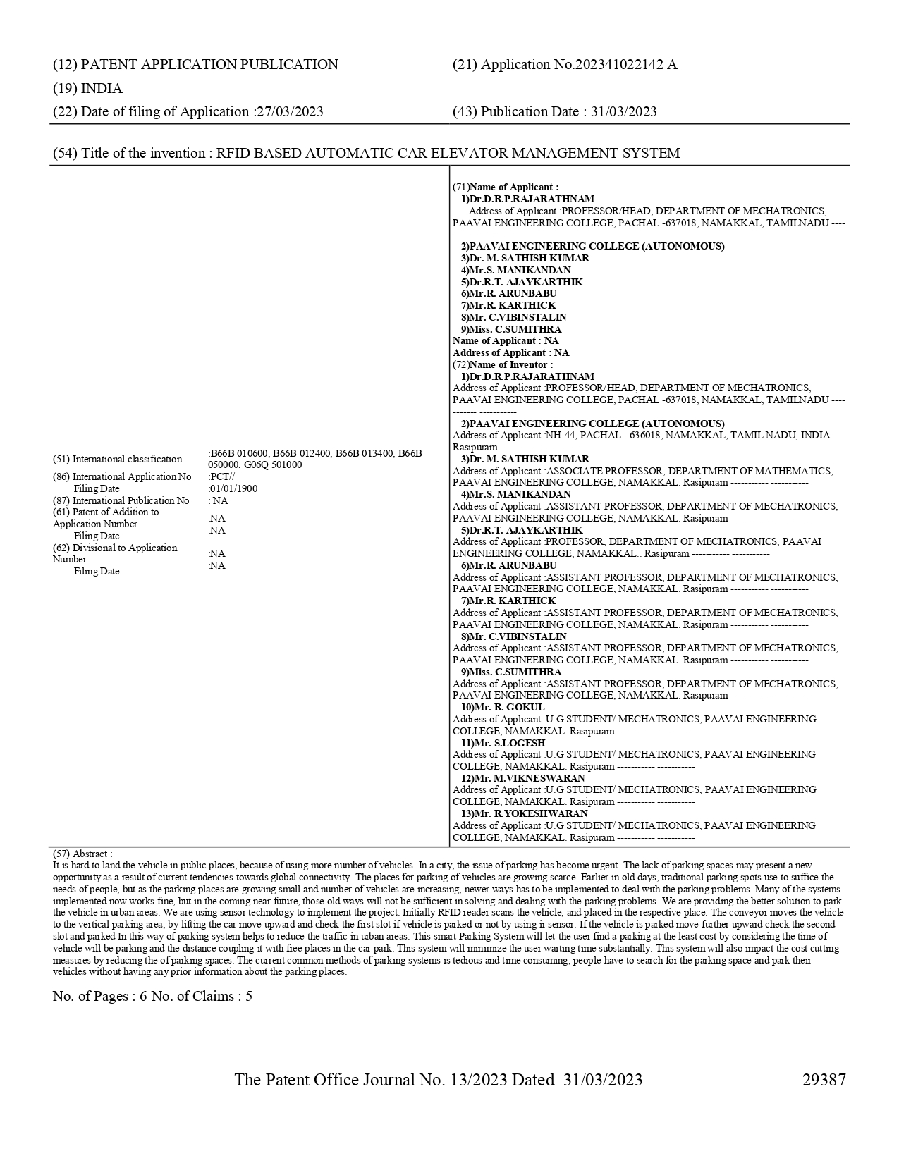 | 9 | Dr.D.R.P. Rajarathnam Dr.R.T. Ajaykarthik Mr.R. Arunbabu Mr.S. Manikandan Mr.R. Karthick Miss. C. Sumithra Mr. C.Vibinstalin | 202341022142 A | RFID Based Automatic Car Elevator Management System | 2022-2023 | 31.03.23 |