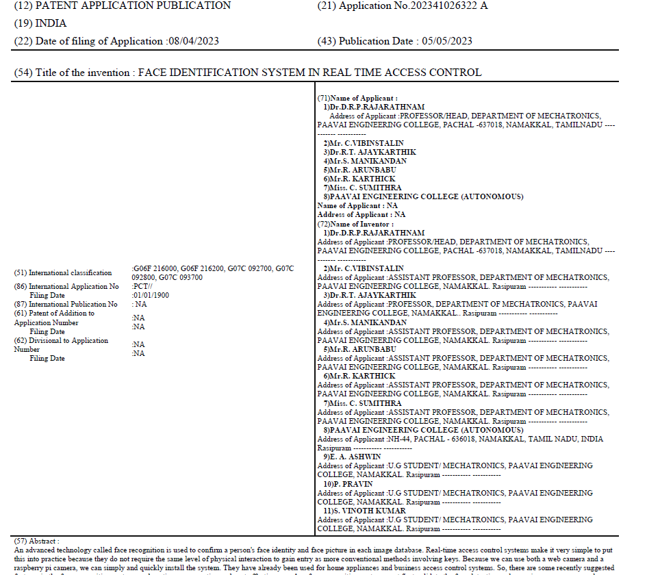 | 5 | Dr.D.R.P. Rajarathnam Dr.R.T. Ajaykarthik Mr.R. Arunbabu Mr.S. Manikandan Mr.R. Karthick Miss. C. Sumithra Mr. C.Vibinstalin | 202341026322 A | Face Identification System In Real Time Access Control | 2022-2023 | 05.05.23 |