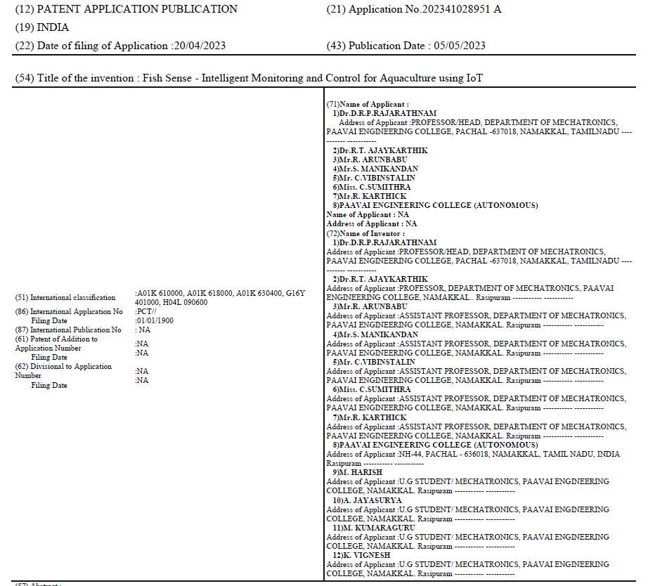 | 6 | Dr.D.R.P. Rajarathnam Dr.R.T. Ajaykarthik Mr.R. Arunbabu Mr.S. Manikandan Mr.R. Karthick Miss. C. Sumithra Mr. C.Vibinstalin | 202341028951 A | Fish Sense – Intelligent Monitoring and Control for Aquaculture Using IoT | 2022-2023 | 05.05.23 |