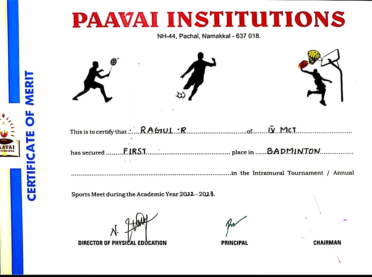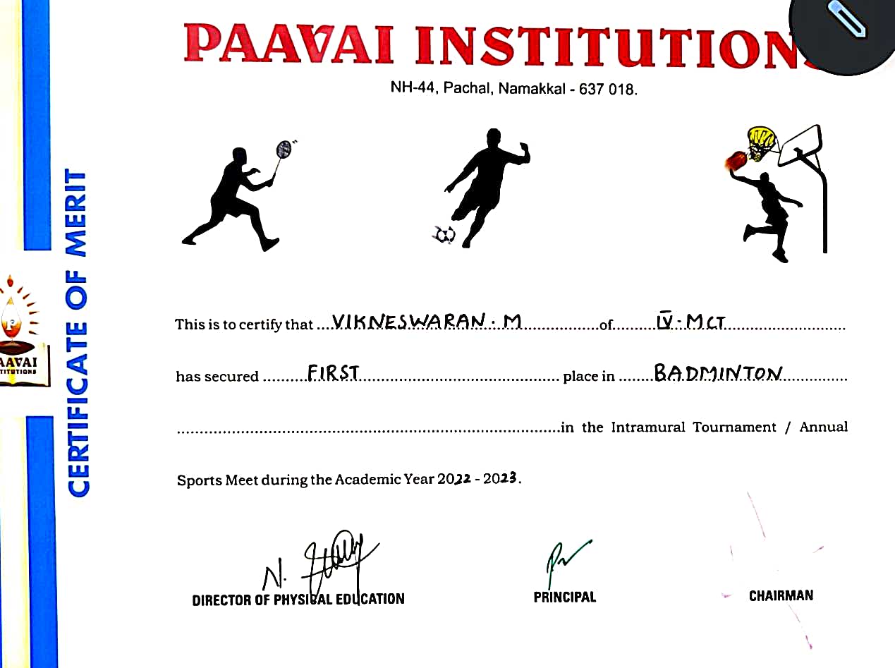 | 6 | Vikneswaran M, Raghul R | 1st prize in Badminton | Sports Day at PEC | View View | |
