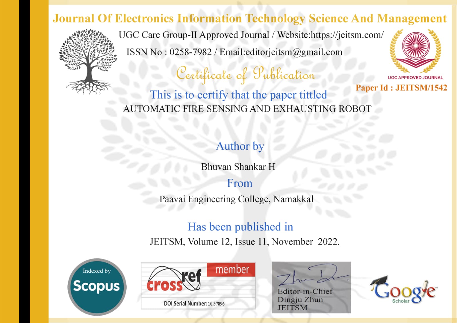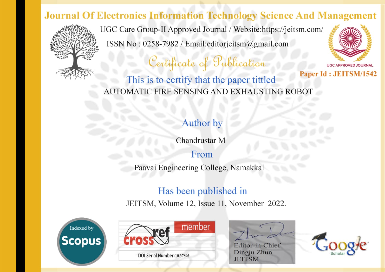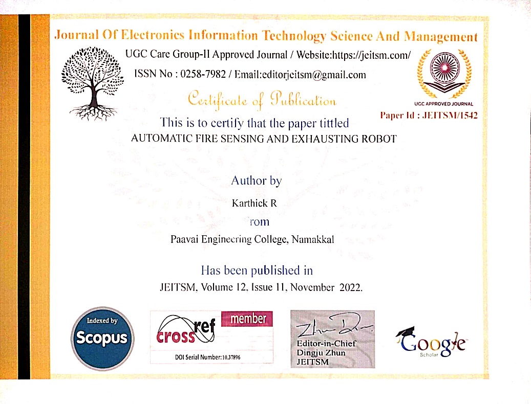 | 7 | Karthick AP/MCT | published in “Journal of Electronics Information Technology Science & Management.” | “Automatic Fire Sensing and Exhausting Robot” | Jan 2023 | View |