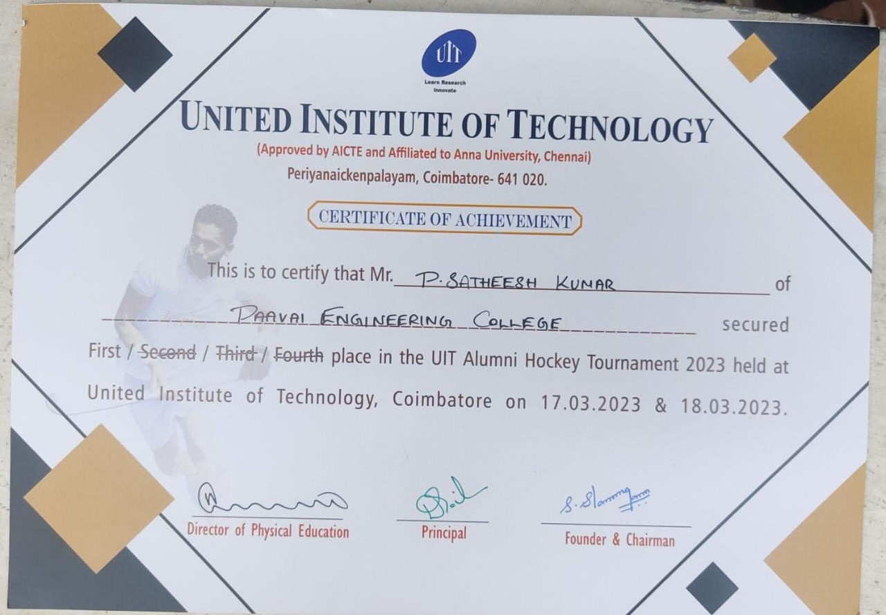 | 8 | Satheeshkumar II MCT | 1st prize in Hockey state level | At United Institute of Technology Alumni Hockey Tournament 2023 | 17.03.2023 and 18.03.2023 | View |
