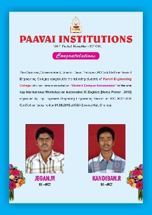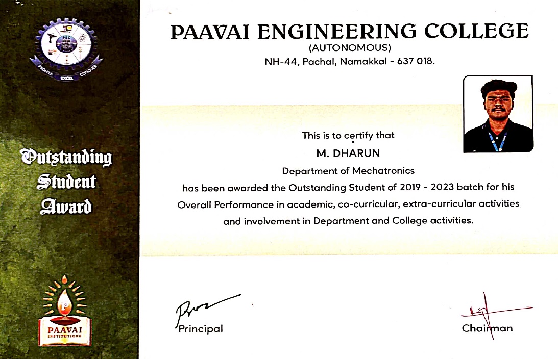 | 2 | M.Dharun | Best Outgoing Student Award | In the academic year 2022-2023 from Paavai Engineering College | 11.03.23 | View |