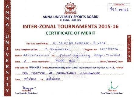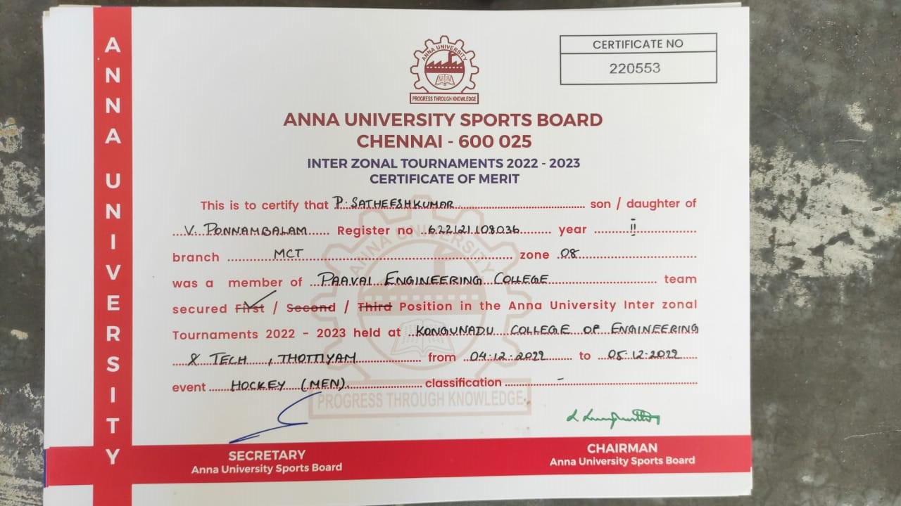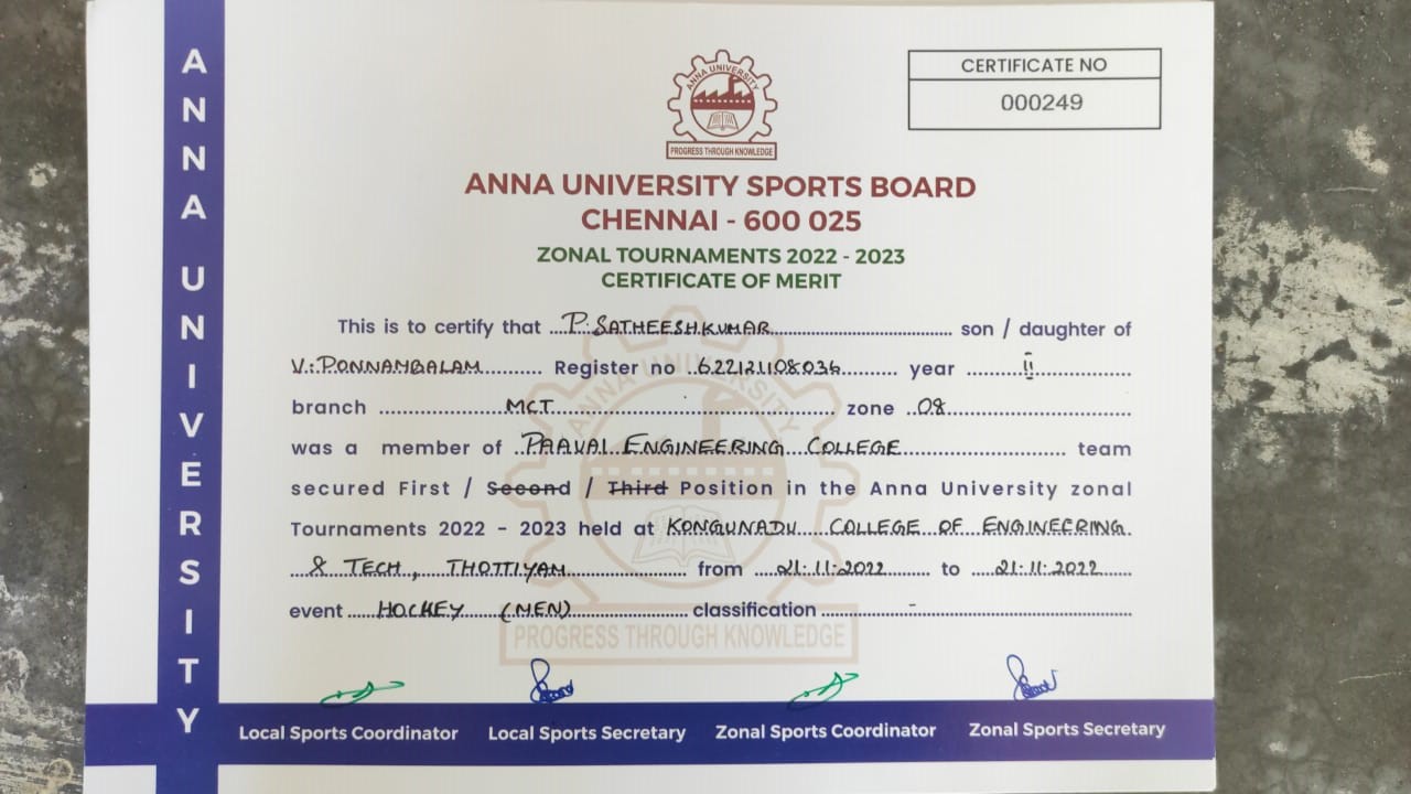 | 11 | Satheeshkumar II MCT | 1st prize in Hockey Zonal level | Kongunadu College of Engineering | View | |