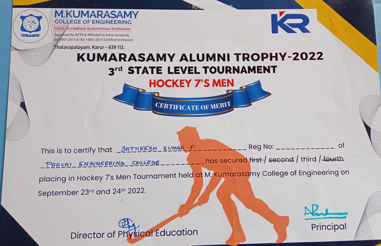 | 12 | Satheeshkumar II MCT | Got 3rd prize in Hockey state level | M.Kumarasamy College of Engineering | View | |
