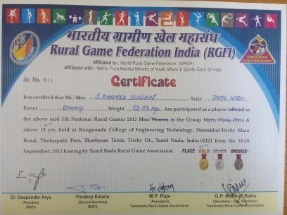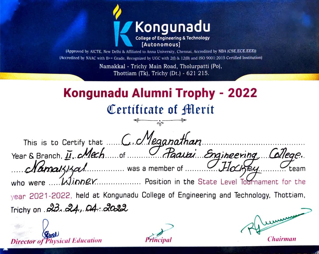 | 13 | Meganathan | 1st prize in Hockey State Level | Kongunadu College of Engineering | View | |