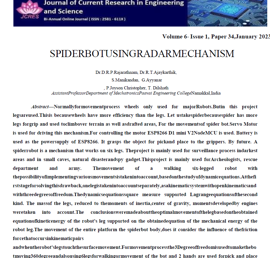 | 15 | Dr. D.R.P Rajarathnam, Dr.R.T.Ajay Karthik, & S.Manikandan | Published in journal of Clutter research in engineering and science | On the topic of “Spider bot using radar mechanism.” | January 2023. | View |