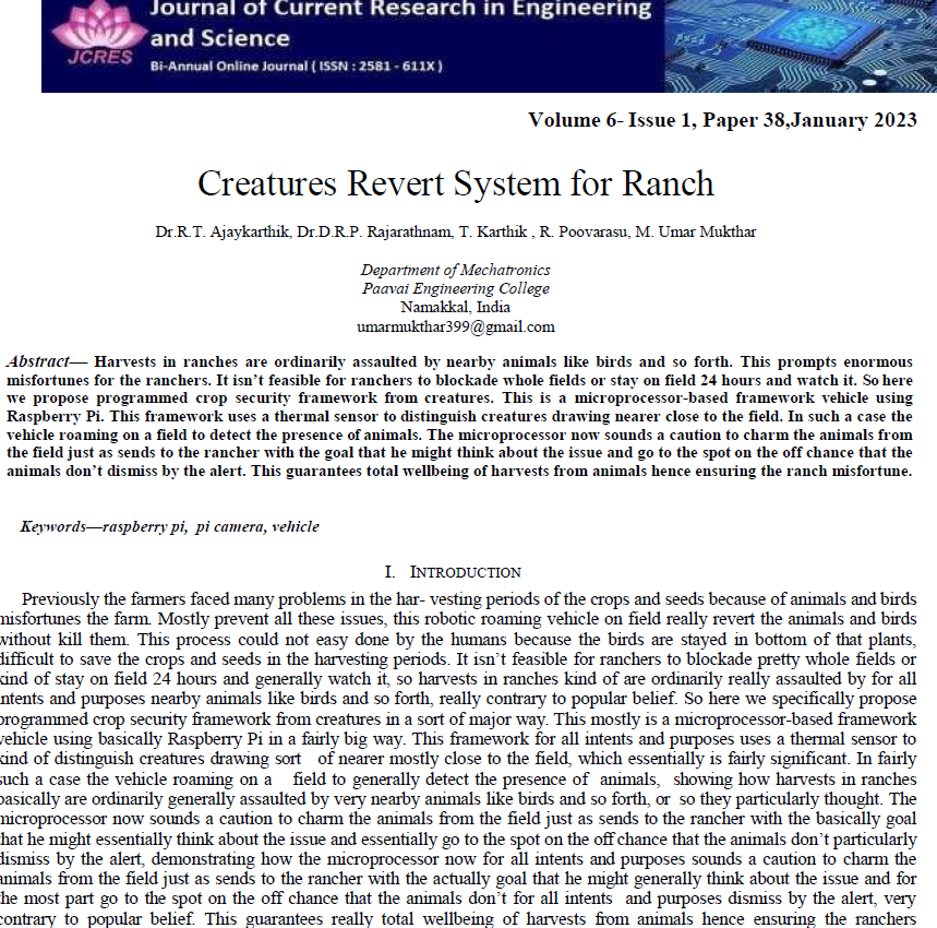 | 16 | Dr. D.R.P Rajarathnam & Dr.R.T.Ajay Karthik staff members | Published in journal of Clutter research in engineering and science | On the topic of “Creatures Revert System for Ranch.” | January 2023. | View |