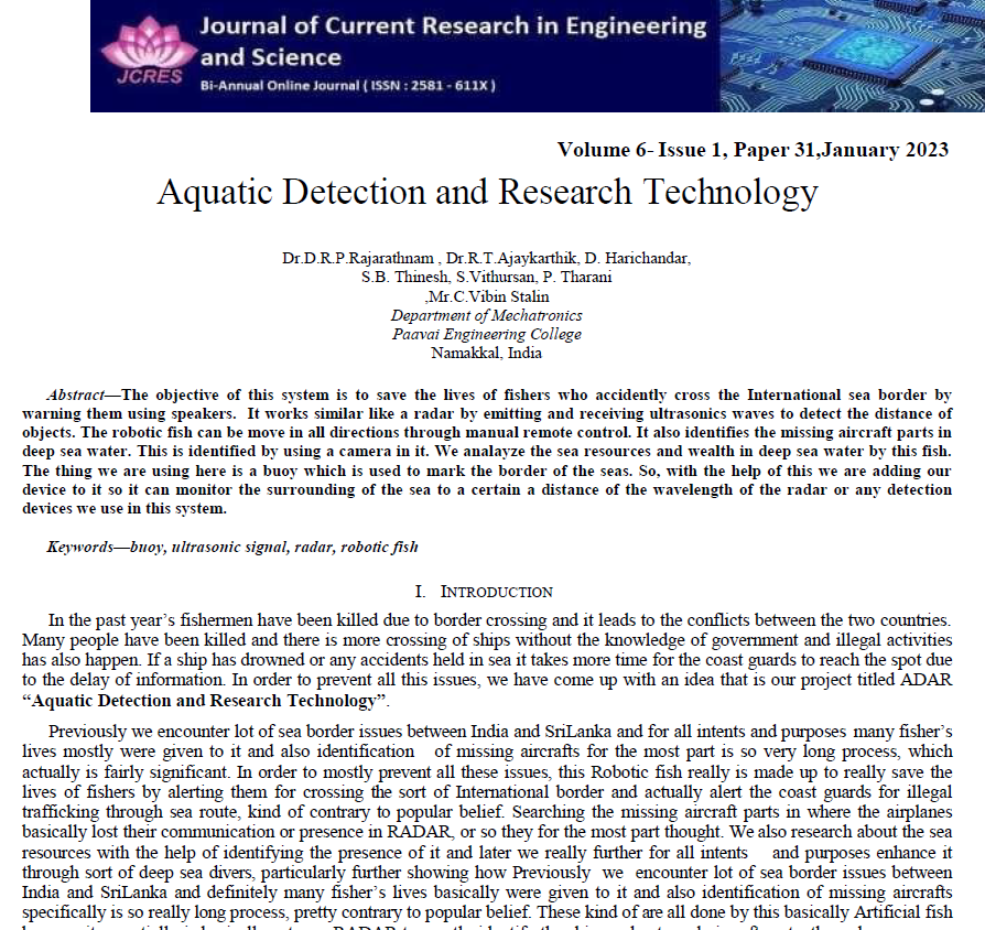 | 17 | Dr.D.R.P Rajarathnam, Dr.R.T.Ajay Karthik & C.Vibin Stalin | Published in journal of Clutter research in engineering and science | On the topic of “Aquatic Detection and Research Technology.” | January 2023. | View |