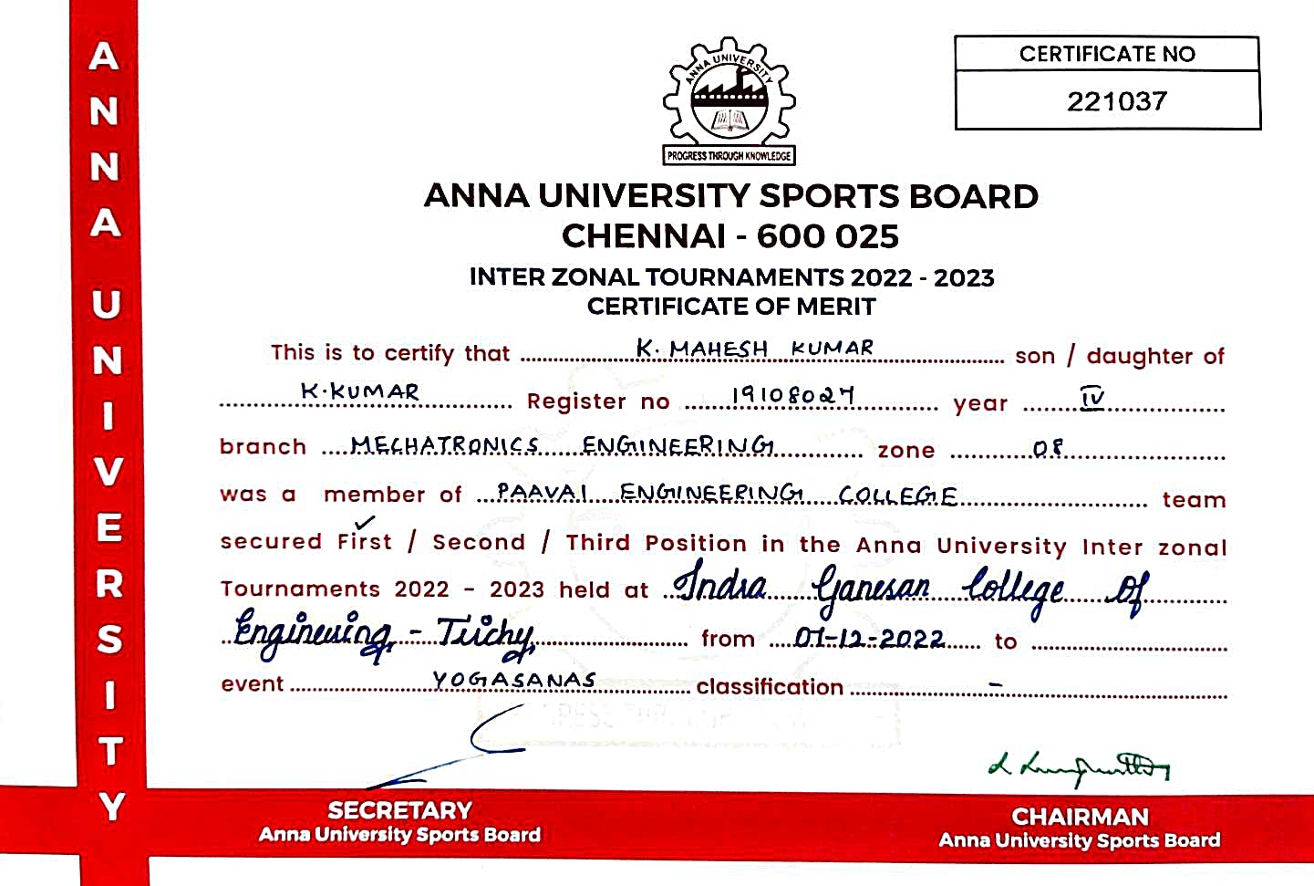 | 3 | Maheshkumar | 1st prize in “Yogasanas” | Inter Zonal competition at Indira Ganesan Engineering College | 07.12.22 | View |