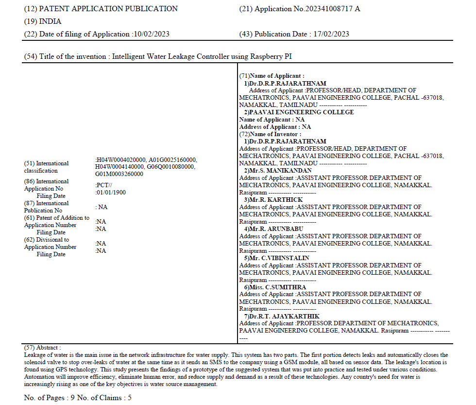 | 12 | Dr.D.R.P. Rajarathnam Dr.R.T. Ajaykarthik Mr.R. Arunbabu Mr.S. Manikandan Mr.R. Karthick Miss. C. Sumithra Mr. C.Vibinstalin | 202341008717 A | Intelligent water leakage controller using raspberry PI | 2022-2023 | 17.02.23 |