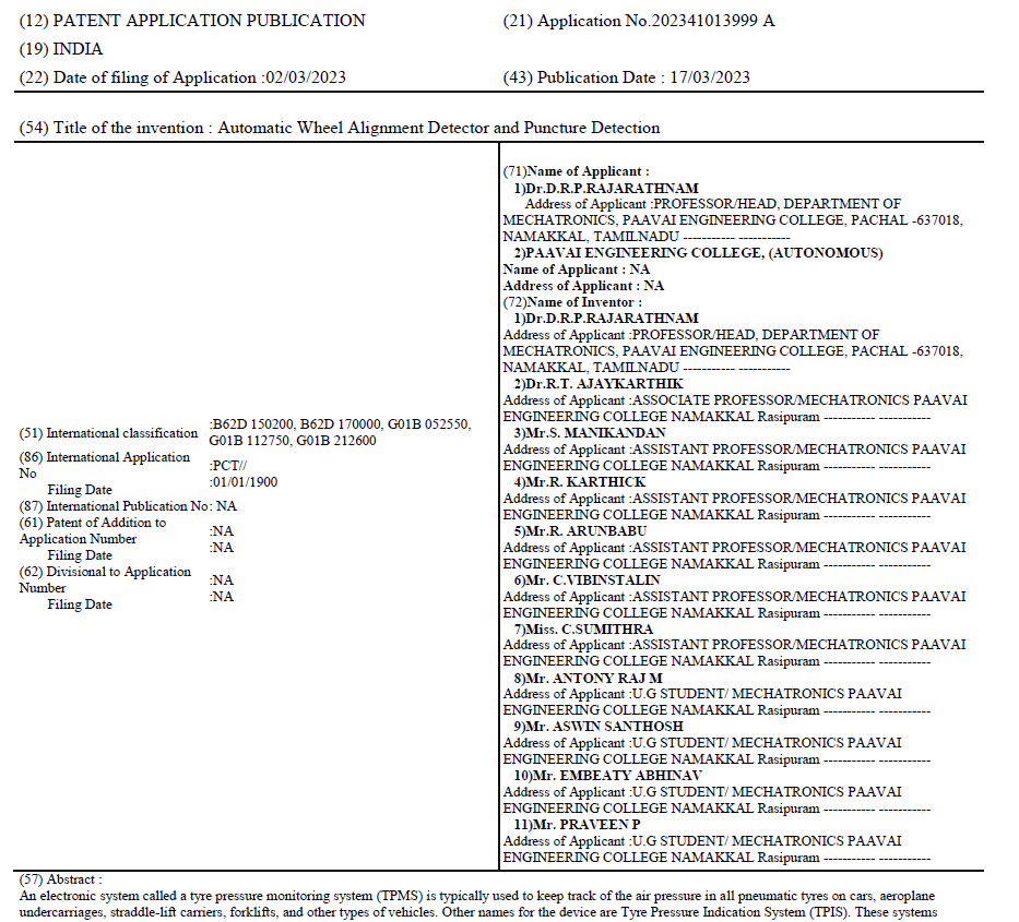 | 10 | Dr.D.R.P. Rajarathnam Dr.R.T. Ajaykarthik Mr.R. Arunbabu Mr.S. Manikandan Mr.R. Karthick Miss. C. Sumithra Mr. C.Vibinstalin | 202341013999 A | Automatic Wheel Alignment Detector and Puncture Detection | 2022-2023 | 17.03.23 |