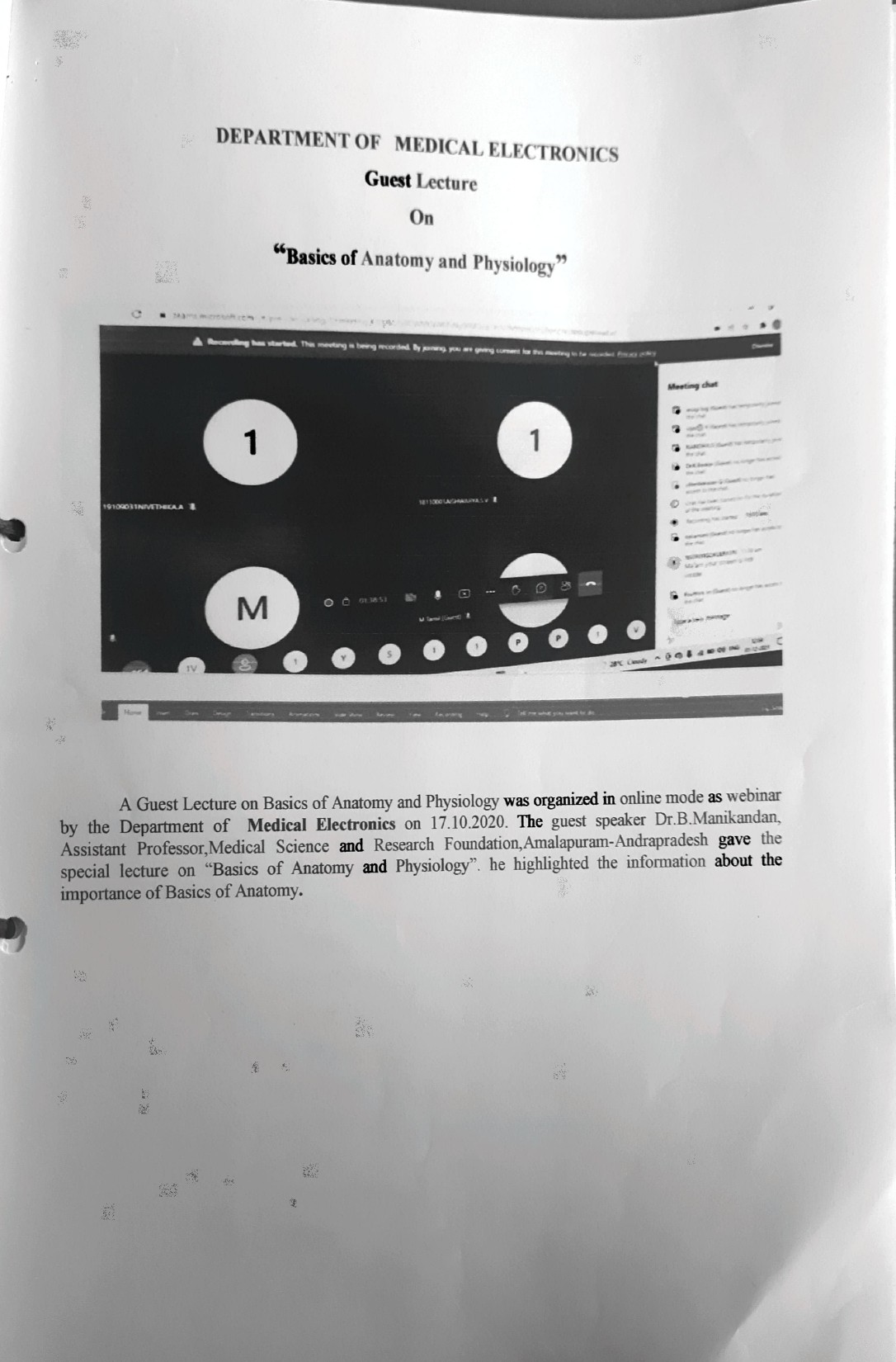 | 1 | Guest Lecture | Basics of Anatomy and Physiology | Dr.B.Manigandan, Assistant Professor, Medical Science and research Foundation, Amalapuram, Andra Pradesh. | Google Meet | 17.10.2020 10.30 am to 12.30 pm. | View |