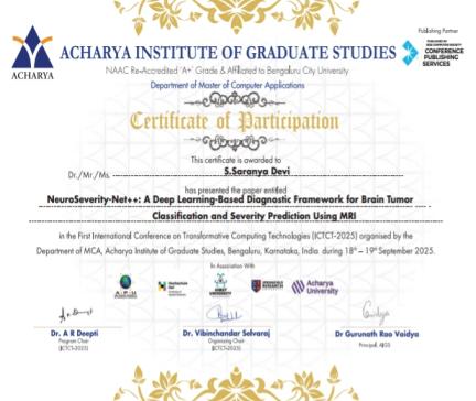 | 3. | S.Saranya Devi | NeuroSeverity-Net++: A Deep Learning-Based Diagnostic Framework for Brain Tumor Classification and Severity Prediction Using MRI | International Conference and Book Chapter Published in IEEE Journal | Acharya Institute of Graduate Studies & 18th- 19th September 2025 | View |
