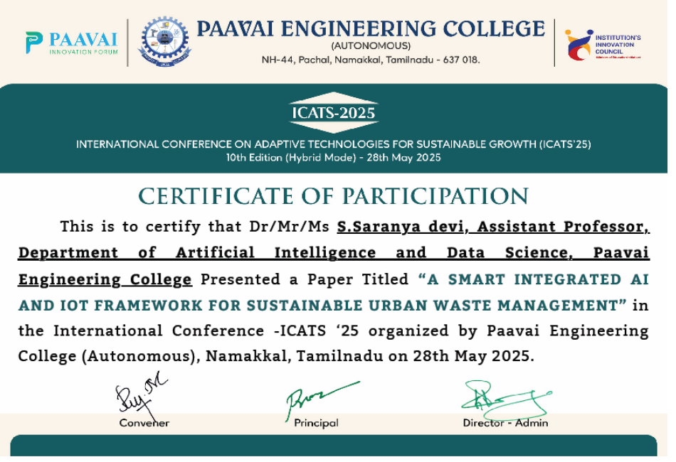 | 2. | S.Saranya Devi | A Smart Integrated AI and IoT Framework For Sustainable Urban Waste Management | International Conference on Adaptive Technologies for sustainable Growth | Paavai Engineering College & 28th May 2025 | View |