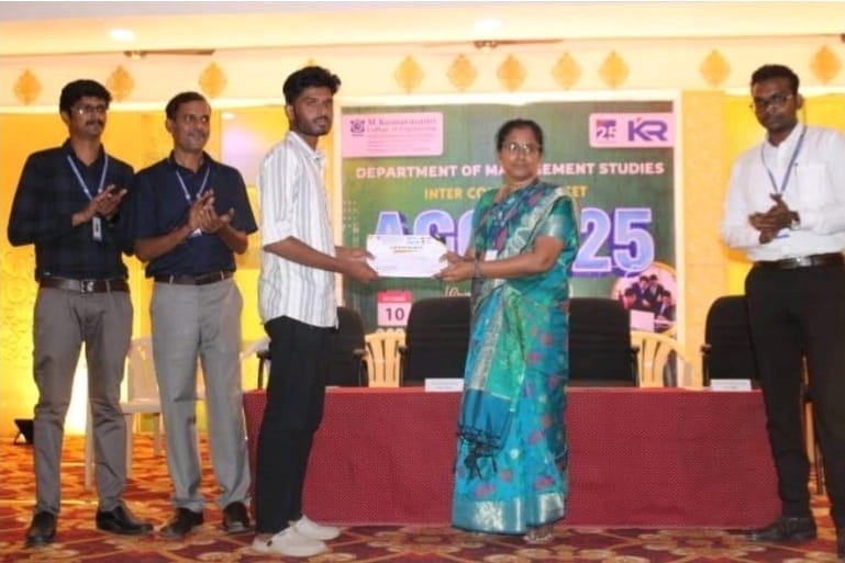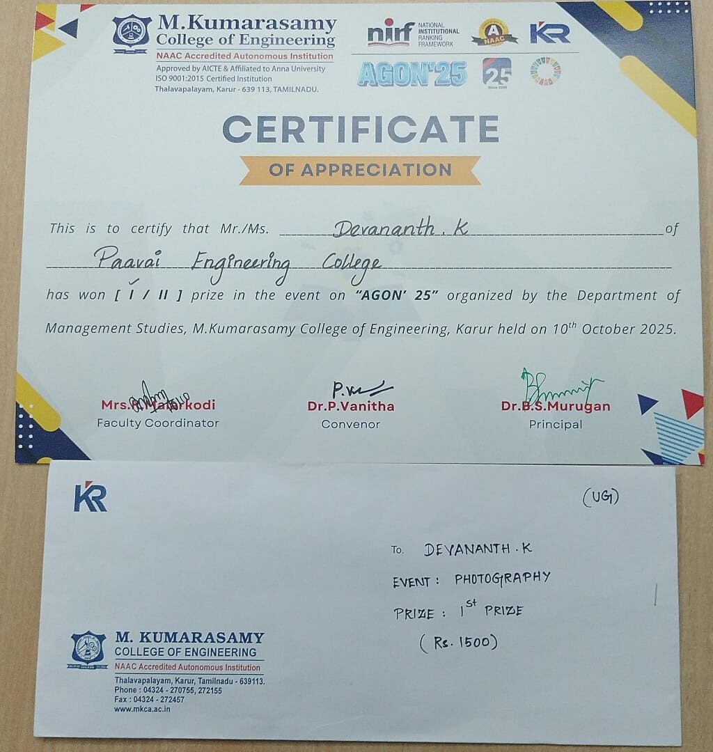 This is to certify that Mr. Devananth K from Pavai Engineering College participated in the event conducted as part of “AGON ’25,” organized by the Department of Management Studies, M. Kumarasamy College of Engineering, Karur, on 10th October 2025, and secured the First Prize in the Photography event, in recognition of his outstanding performance and creative skills. The event was coordinated by Mrs. S. Vikodi (Faculty Coordinator) and convened by Dr. P. Vanitha, under the guidance of Principal Dr. B. S. Murugan. The college congratulates Mr. Devananth K on this remarkable achievement and appreciates his dedication and excellence.