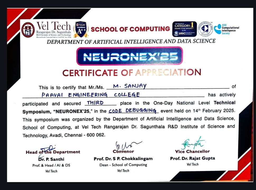 Mr. M. Sanjay of Paavai Engineering College actively participated in the One-Day National Level Technical Symposium NEURONEX ’25 organized by the Department of Artificial Intelligence and Data Science, School of Computing, Vel Tech Rangarajan Dr. Sagunthala R&D Institute of Science and Technology, Avadi, Chennai.He secured Third Place in the Code Debugging event held on 14th February 2025, demonstrating strong technical and problem-solving skills.The event provided a competitive platform for students to showcase their programming expertise and analytical abilities.His participation reflected dedication, technical competence, and enthusiasm toward learning and innovation.This achievement is highly commendable and stands as a motivation for academic and professional excellence.