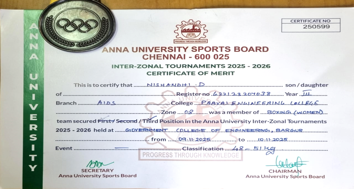 This is to inform you that Ms. D. Nishanthini, Our IIIrd Year student of the Department of Artificial intelligence and data science, Register No. 622123207038, participated in the Boxing held on 9th&10th Nov 2025.She represented the college with prior approval from the department. Her participation required absence from regular academic activities during the event period. We kindly request you to consider the same and extend necessary concessions as per norms. Relevant documents are enclosed for your reference.