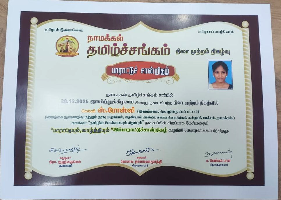 This is to inform you that Ms. S. Rosely, a II Year student of the Department of Artificial Intelligence and Data Science, participated in a Tamil Speech Competition, as evidenced by the enclosed printed certificate. The event was conducted on 29th December 2025. She represented the institution with prior approval from the department. Her participation was on behalf of the department and the institution. Her involvement in the event required her absence from regular academic activities. The student’s participation reflects active academic and cultural engagement. The printed participation certificate is enclosed for your kind reference.