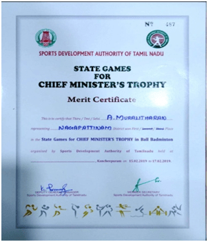 2A.MuralitharanCivil EngineeringIIIfirst place in State Games for CHIEF MINSTER’S TROPHY in Ball Badminton with a cash prize of Rs.1, 00,000/-Organized by Sports Development Authority of TamilNaduView