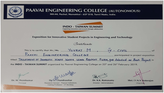 2B.E Civil Engineering studentsCivil EngineeringIII & IVVolunteers for Build Expo and displayed the project “Treatment of Automobile Wastewater using Terafill candle filter”Project Expo Contest “Emerging Engineers”View