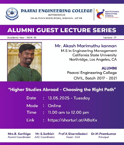 Prof.K.Sharmiladevi mentors students and staff in research and innovation activities. Notably, during the MSME 2.0 HACKATHON, her mentored students received project grants of 13.35 lakhs for their solid waste management project. She ensures her students gain practical experience by arranging internships at the National Highway Authority of India (NHAI) every year. Additionally, she encourages faculty and students to engage in consultancy work, including testing construction materials, surveying, and design. Her passion for teaching drives her commitment to the betterment of the student community.