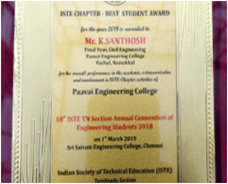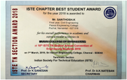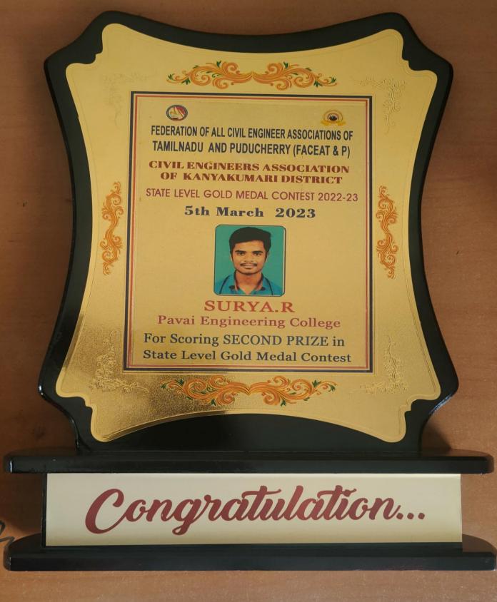 1Mr.R.SuryaCivil EngineeringIVSecured state level 2nd prize in Gold Medal ContestOrganized by the Federation of all Civil Engineers Associations of Tamil Nadu and Puducherry (FACEAT & P); Awarded with 2 Gram Gold Coin with a ShieldView