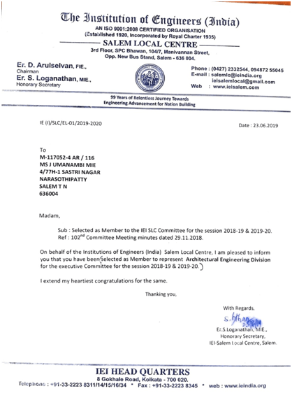 J.UmanambiThe Institution of Engineers, Salem Local CentreSelected as Member to Represent “Architectural Engineering Division” for the Executive Committee for the session 2019-2020