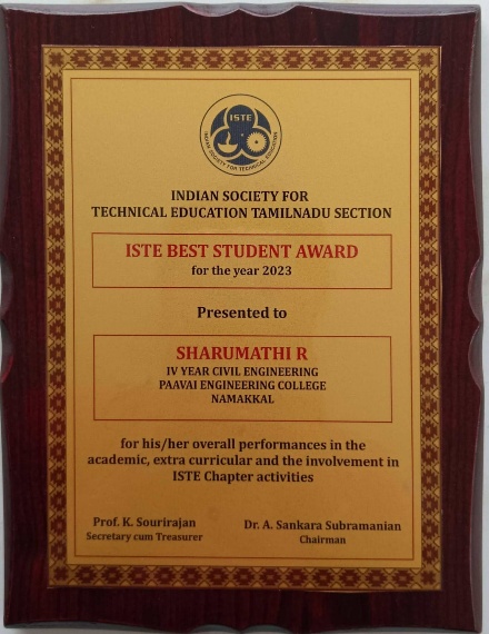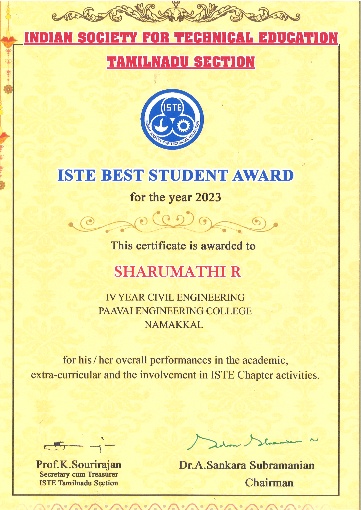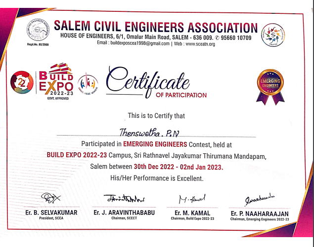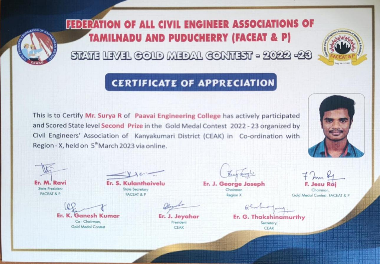 | 1. | M.Dhanush S.Vijay K.Hemavathi S.Harikeerthi | IV/Civil | Rs.1500-Cash Prize/ Award | Salem Engineering College,Salem-12th National Level Symposium | View |