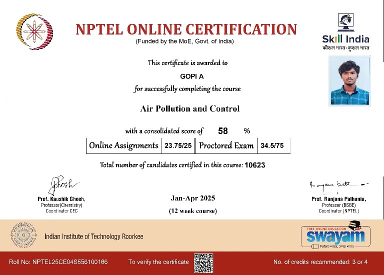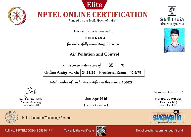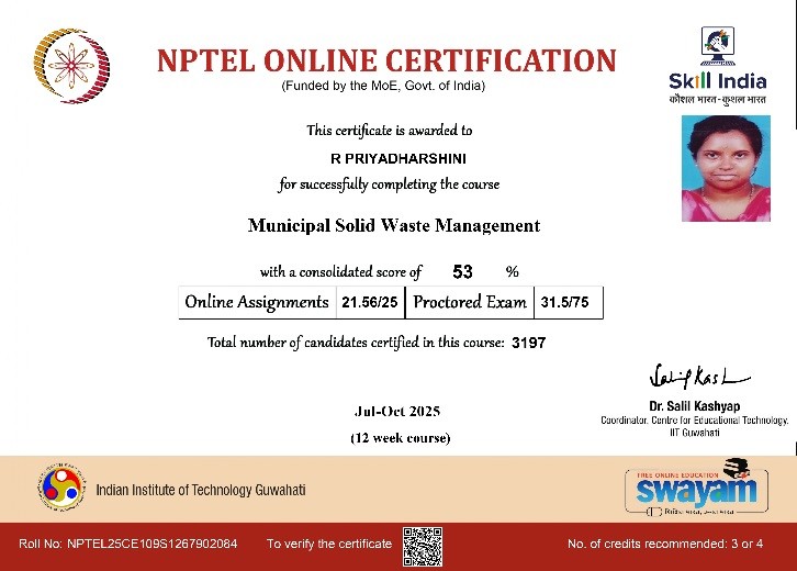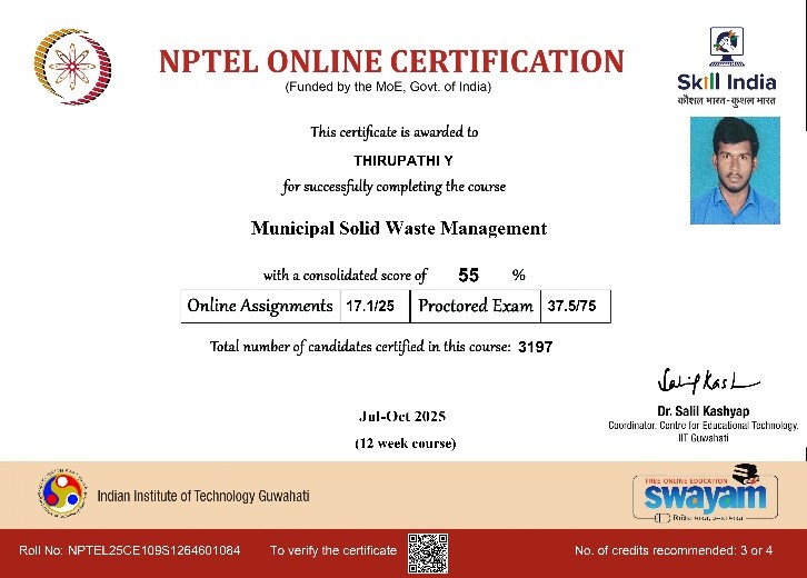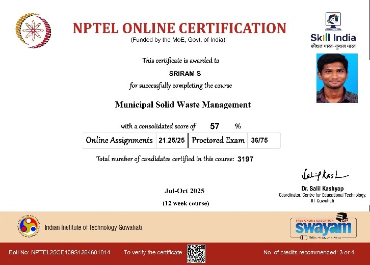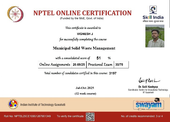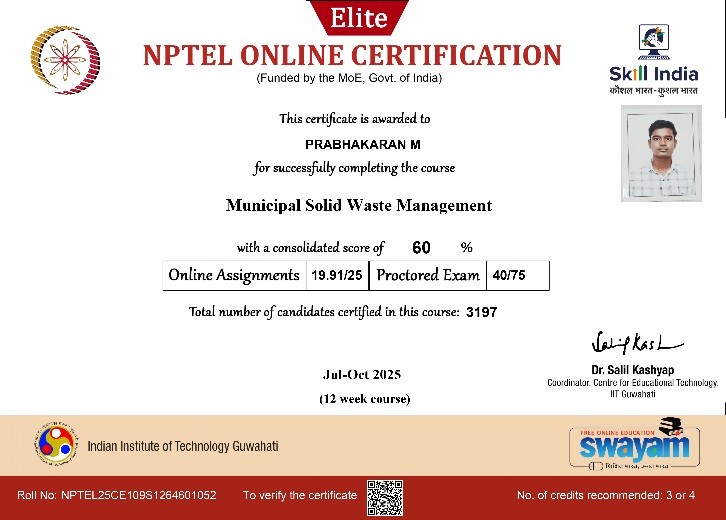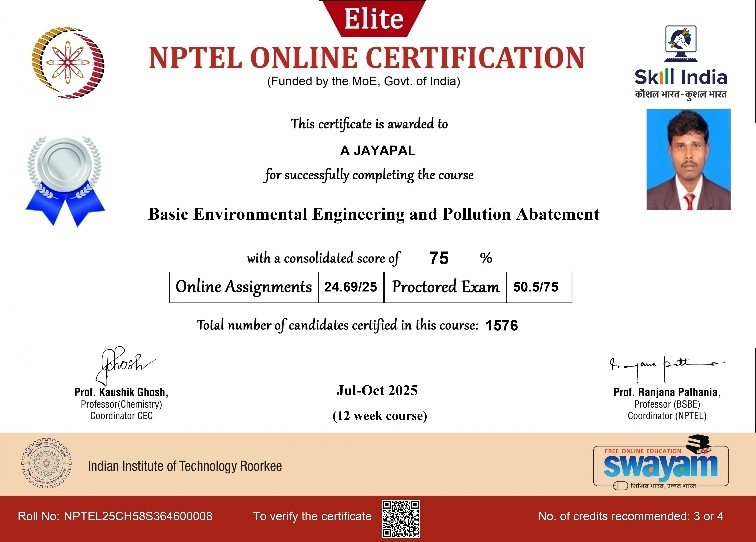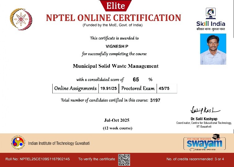 | 3 | Jayapal A | Assistant Professor | Municipal Solid waste Management | Completed with Elite |