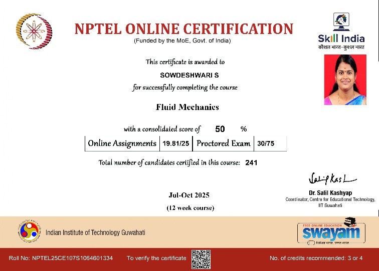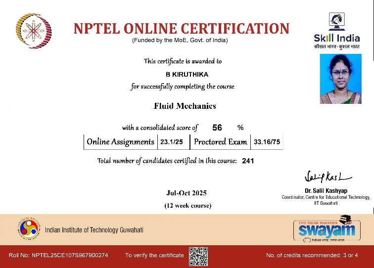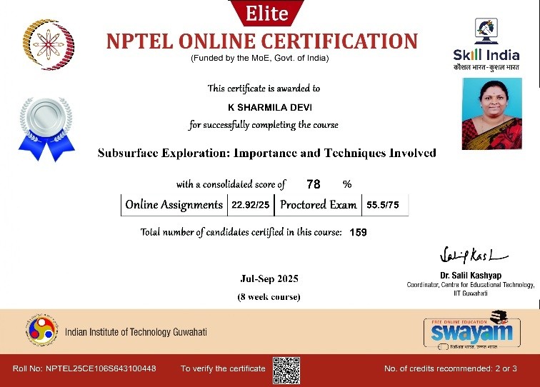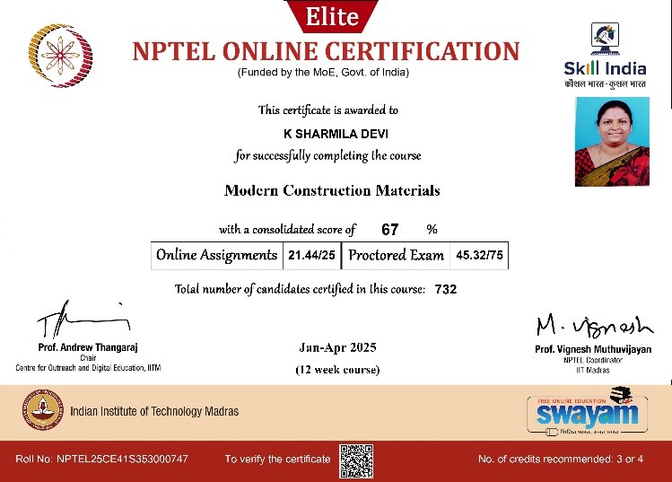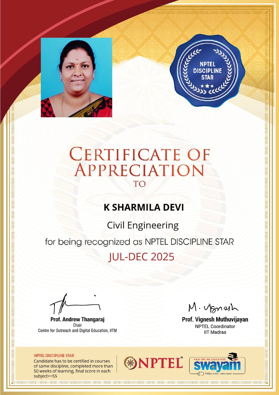 | 2 | Sharmiladevi K | Associate Professor& HoD | Modern Construction materials | Completed with Elite |