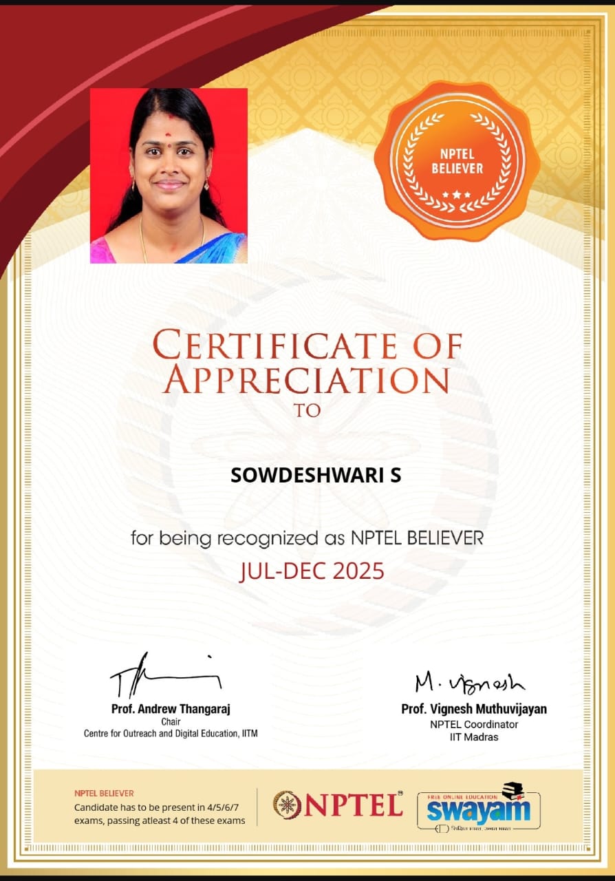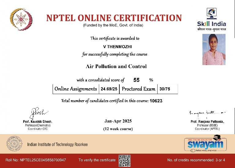 | 2 | Sharmiladevi K | Associate Professor& HoD | Air Pollution and Control | Completed with Elite |