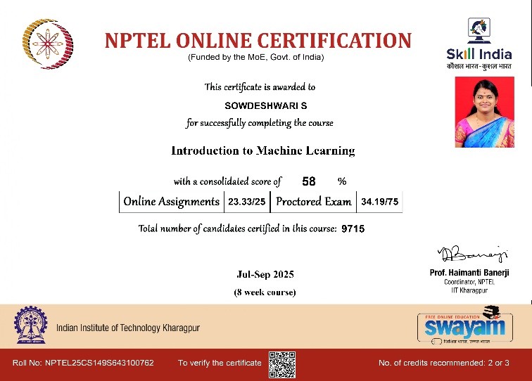 | 1 | Sharmiladevi K | Associate Professor& HoD | Project Planning & Control | Completed with Elite |