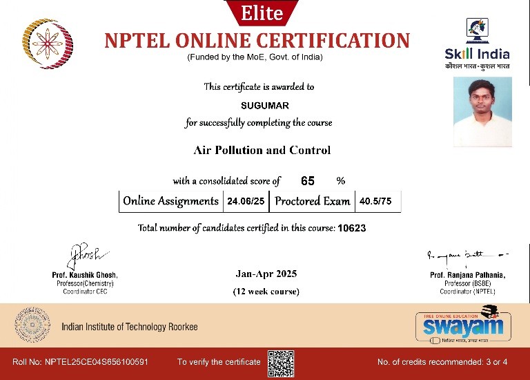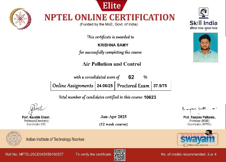 | 1 | Akalya T | III | Air Pollution and Control | Completed with Elite |