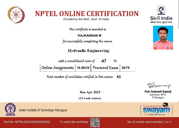 | 7 | Rajkannan M | Assistant Professor | Hydraulic Engineering | Completed |