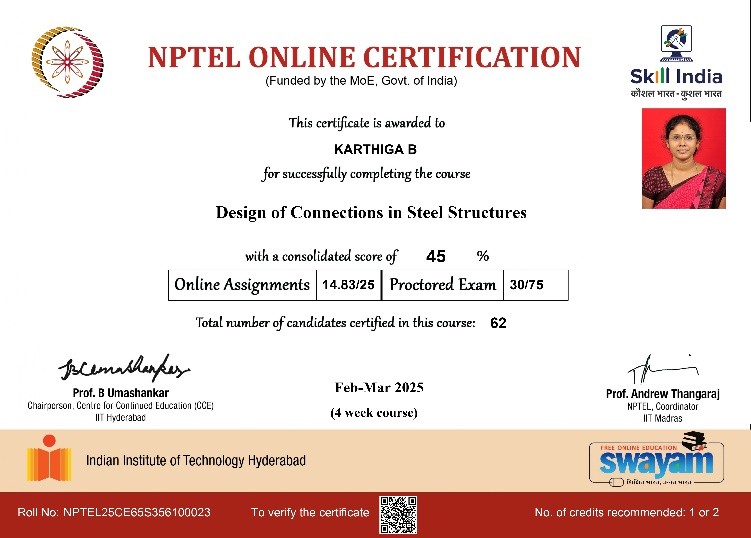 | 9 | Karthiga B | Assistant Professor | Design of Connections in Steel Structures | Completed |