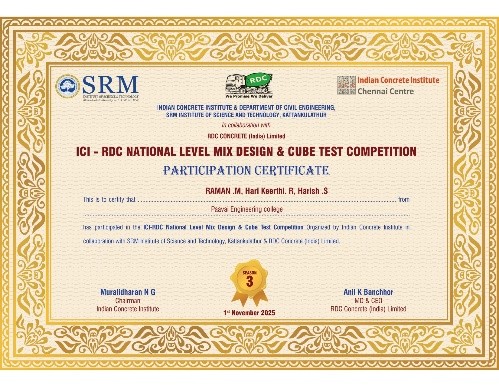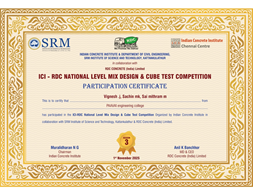| 7 | S.Harish R.Harikeerthi M.Raman R.Sugumar A.Kuberan S.Vijay | IV/ Civil | Completed Second Stage | National Concrete Cube Test Competition At Srm Institute Of Science And Technology, Kattankulathur | View View |